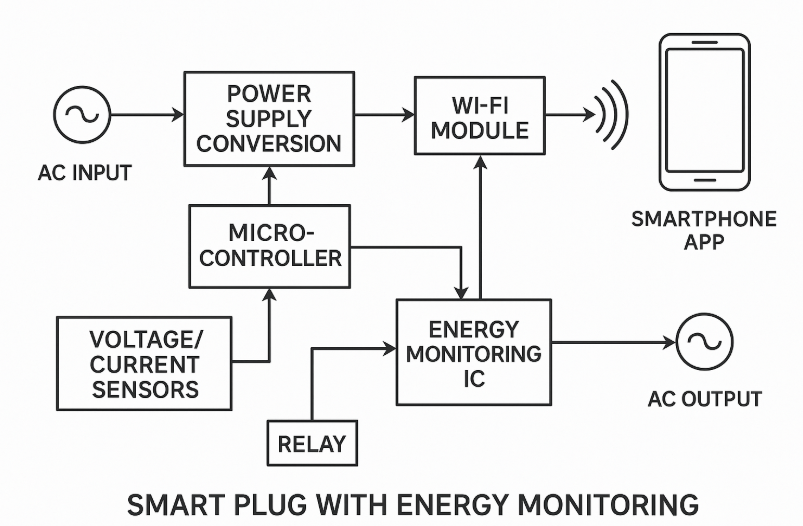 The smart plug begins with AC mains input (typically 110-240V AC) that feeds into two parallel paths: